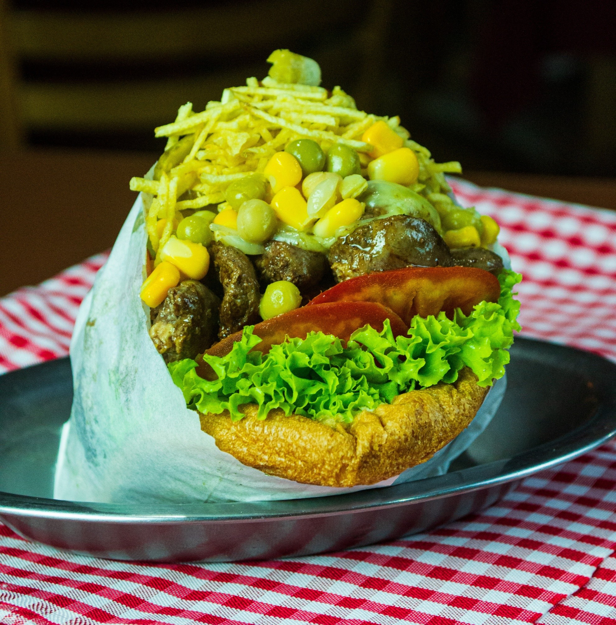 Pão, Queijo, Apresuntado, Alface, Tomate, Pepino, Milho, Ervilha, Batata Palha, Não acompanha hambúrguer