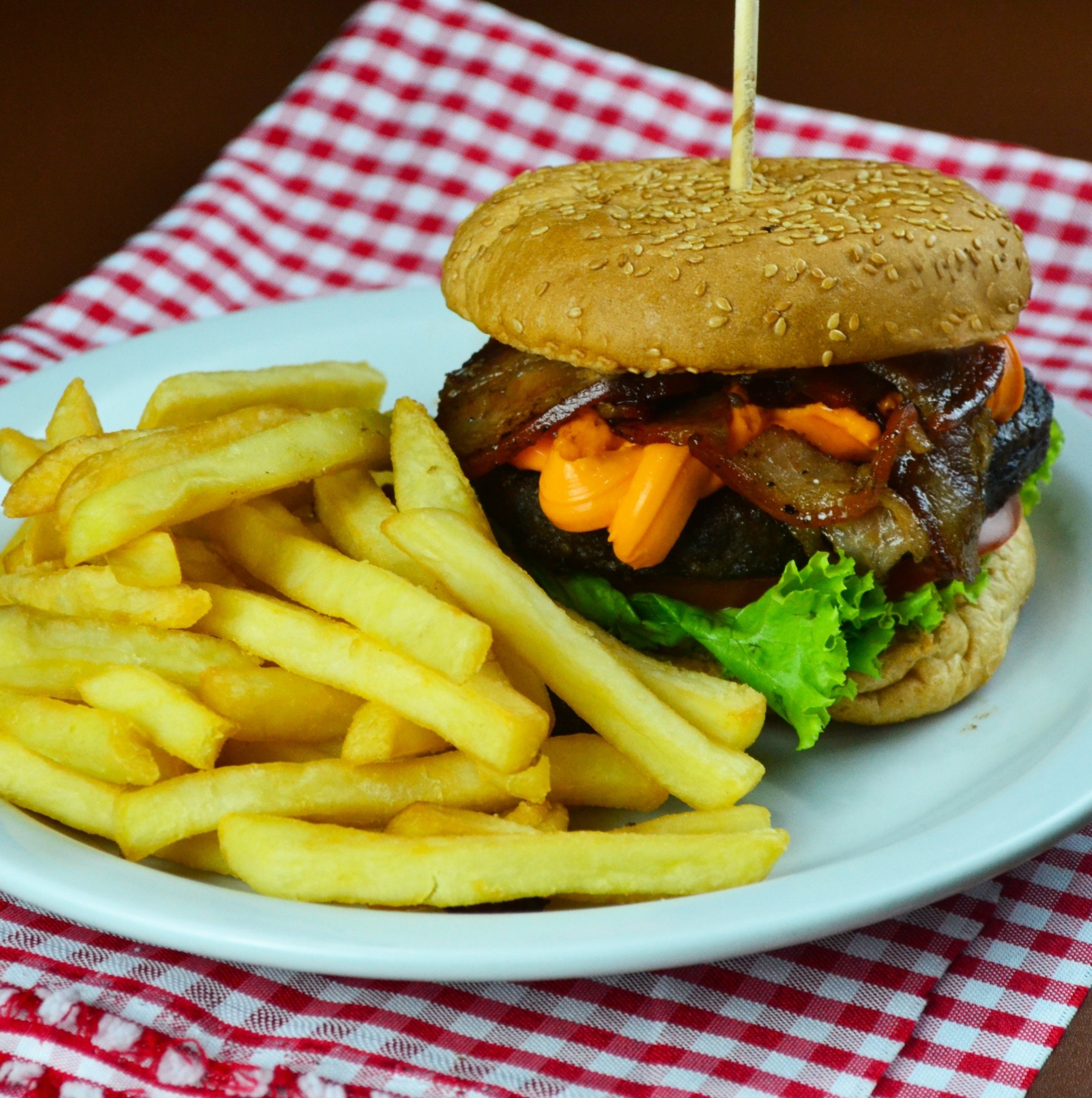 Hambúrguer Caseiro 160 gr, Tomate, Alface, Cheddar, Bacon, Pão c/ Gergelim, Fritas