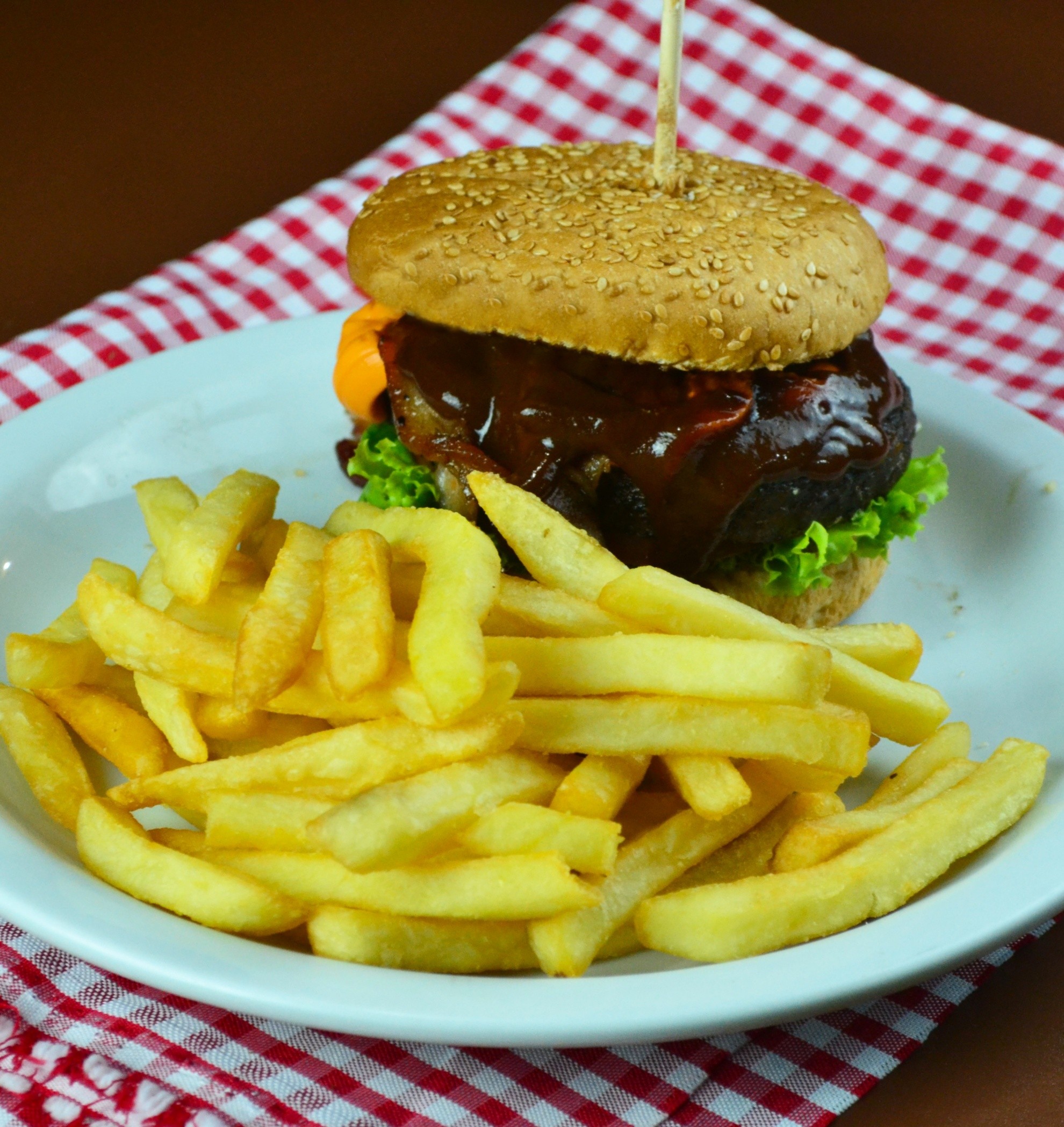 Hambúrguer Caseiro 160 gr, Tomate, Alface, Cheddar, Barbecue, Bacon, Pão c/ Gergelim, Fritas